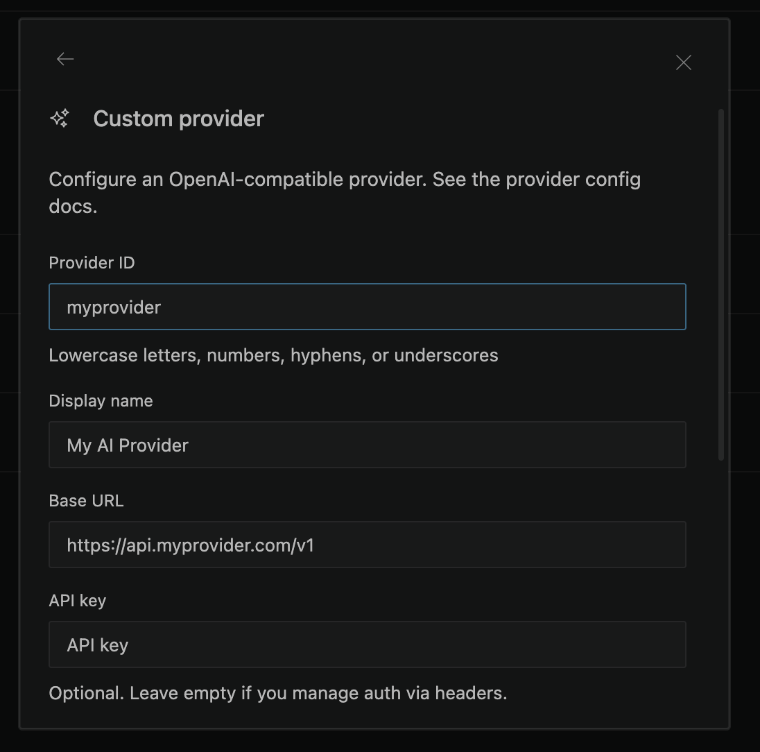 myprovider). This becomes theprovider_idin theprovider_id/model_idformat. - Display name — A human-readable name shown in the UI (e.g.,