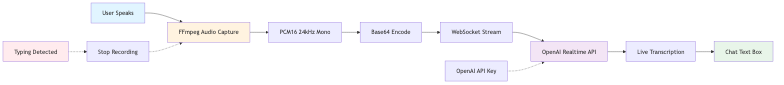 The system follows a straightforward streaming architecture where user voice input is captured by FFmpeg, streamed as PCM16 audio to OpenAI's Realtime API via WebSocket, and transcribed text is displayed live in the chat input box. Typing interrupts recording instantly.