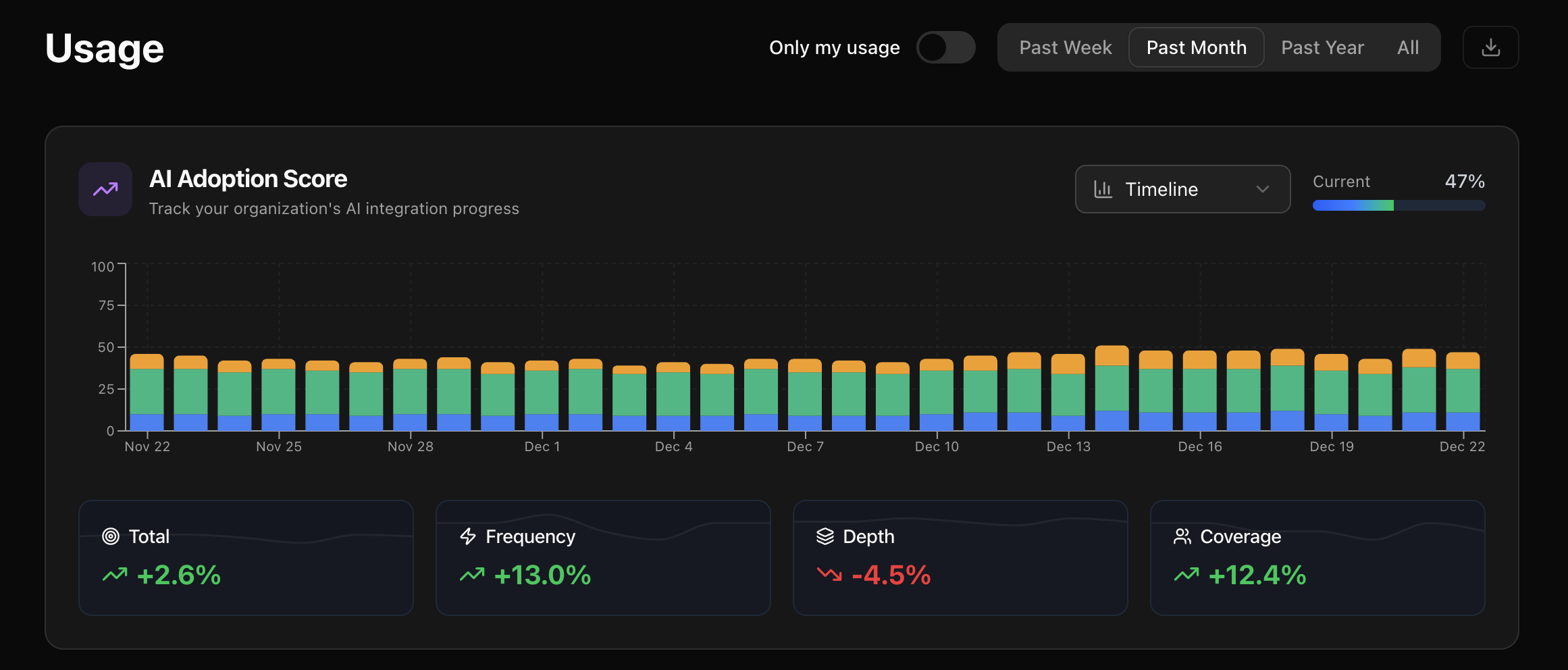 • Orange — Coverage (how broadly AI is adopted across the team)